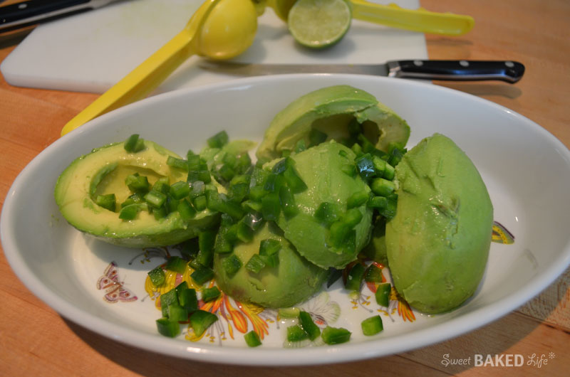 - Cut the jalapeño in half to remove the seeds, then dice and add to avocado.