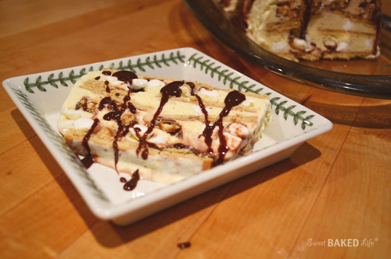 To assemble, place one layer of graham crackers on the bottom of the loaf pan. Cover the bottom entirely, breaking the squares to make them fit, but be sure not to overlap. Spoon 1 bowl of your ice cream mixture over the layer of graham crackers and smooth with the back of the spoon. Then drizzle about 1/2 cup of the chocolate fudge sauce over the top of the ice cream.  Repeat layering 1 more time and then top with one more layer of graham crackers.  Cover with the overhang of plastic wrap and press down gently.