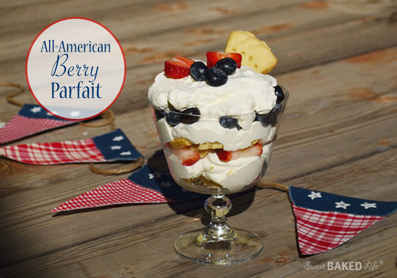 With the hot streak continuing this week, I’m definitely not thinking much about turning on my oven! You see, our weather service is predicting that we could come close to tying a record of 6 days in a row of 105 degree temperatures and by the end of this week we will probably have about 9 days in a row of over 100 degree heat! So with a sweltering holiday approaching, visions of cool red, white and blue desserts are dancing in my head! And in keeping with my theme this summer of no-bake delicious and refreshing desserts, you’ve got to try this scrumptious quick and easy All-American Berry Parfait. The airy whipped cream against the juicy fresh strawberries and blueberries with just a bit of crunch from the cookies will be a fabulously cool dessert to serve your friends and family after a hot day in the sun!