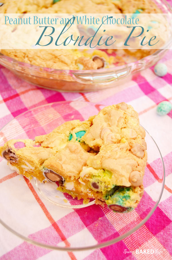 What’s your favorite kind of pie? Can I tempt you with a Peanut Butter and White Chocolate Blondie Pie? It’s fun and delicious and definitely my kinda pie! It has a wonderfully soft buttery base sprinkled with pretty peanut butter eggs and dotted with white chocolate chips! And perfect for any springtime celebration!