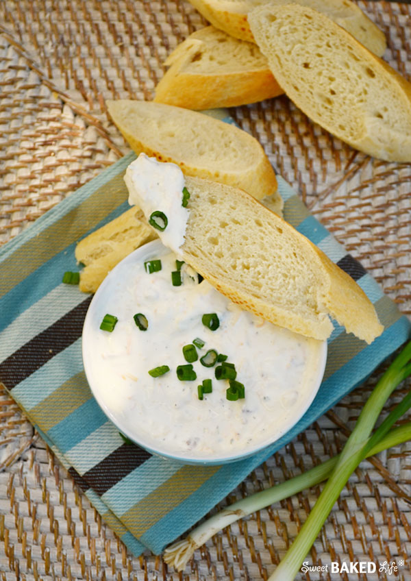 This creamy goodness starts with smooth sour cream, mixed with sharp cheddar cheese, crunchy bacon bits, tangy ranch seasoning and fresh green onions. It does not get much easier than that!