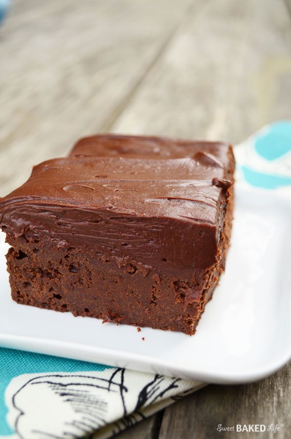 I instantly fell in love after taking my very first bite of this cold cake! You start by making a brownie-like cake layer then top it off with thick, glimmering chocolate frosting! The moist, dense cake texture combined with the silky frosting — ah, don’t think I need to say  more!