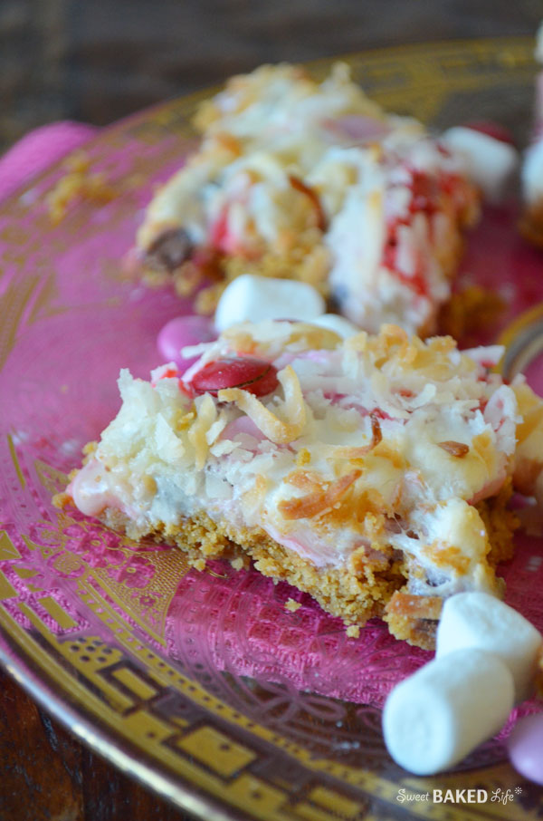Beautiful magic cookie bars are reinvented with pretty chocolate valentine M&M’s!