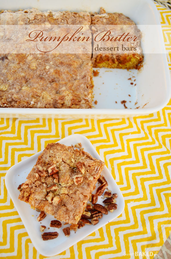 Pumpkin Butter Dessert Bars: This is a super easy, super delicious dessert that uses prepared cake mix and a jar of pumpkin butter! Delish!