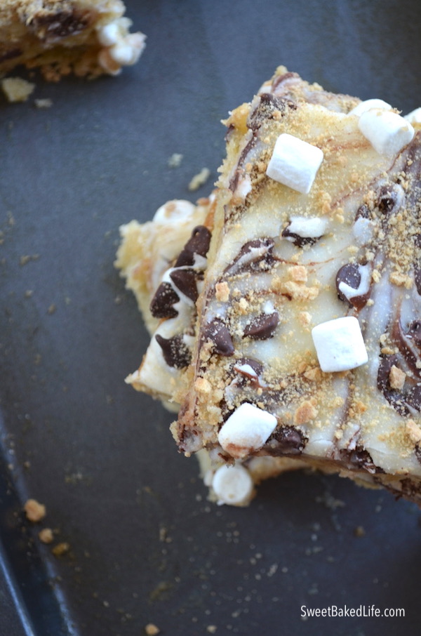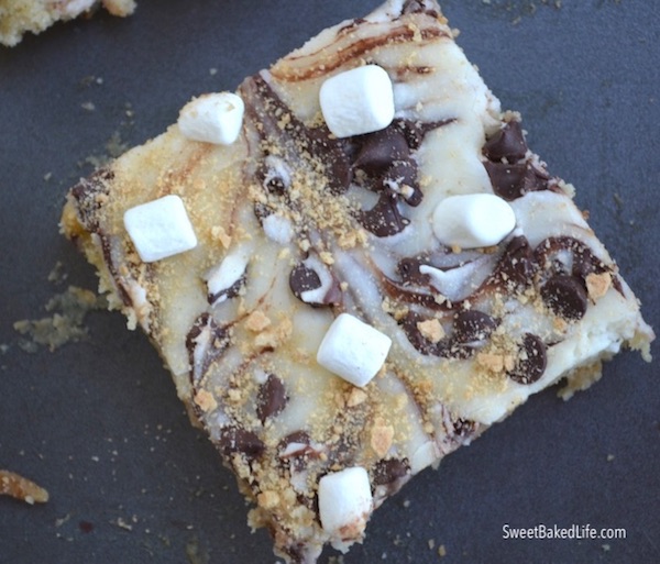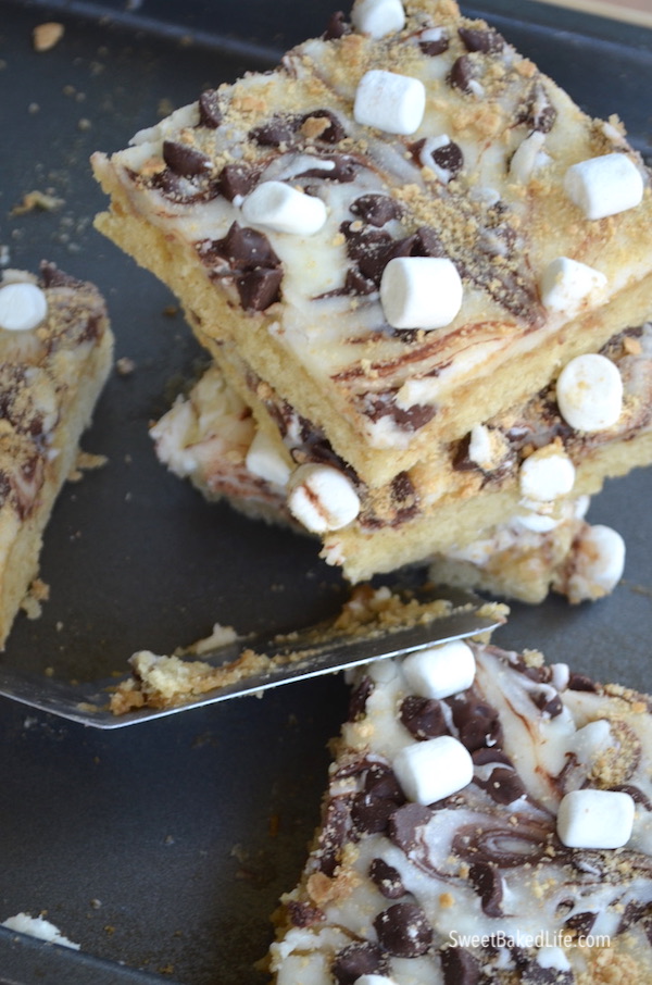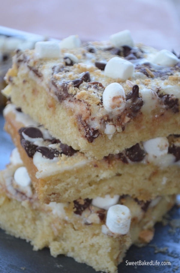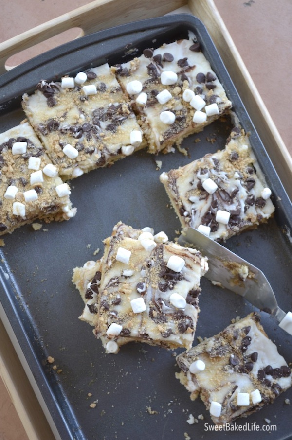 - Top off with some extra mini marshmallows and crushed graham crackers. Let cool completely before cutting into large squares. If you have any cake remaining, cover with plastic wrap.
